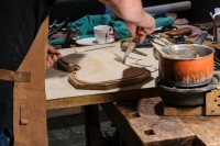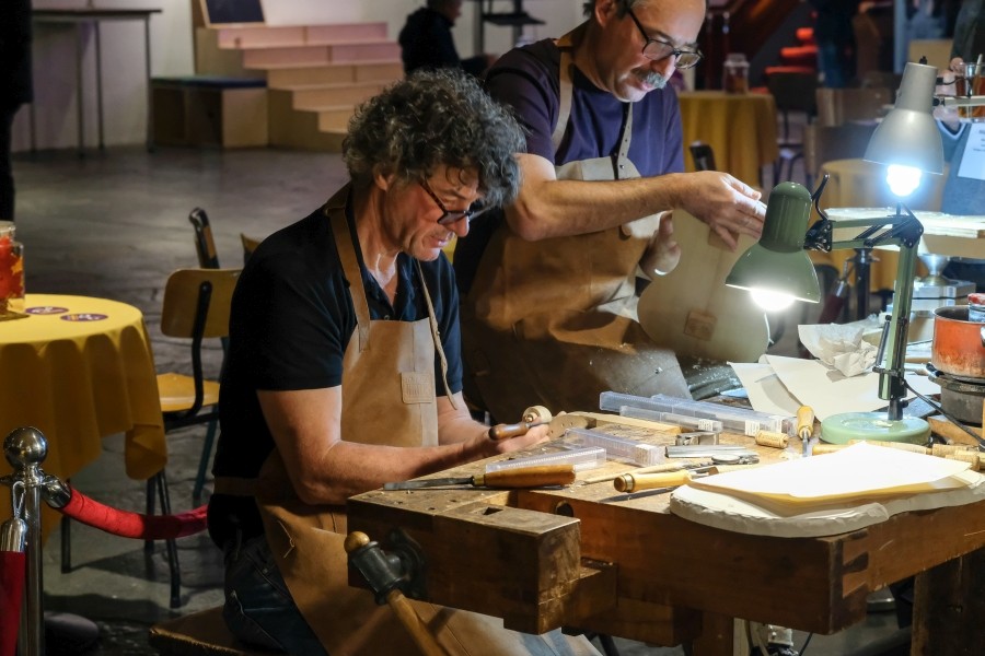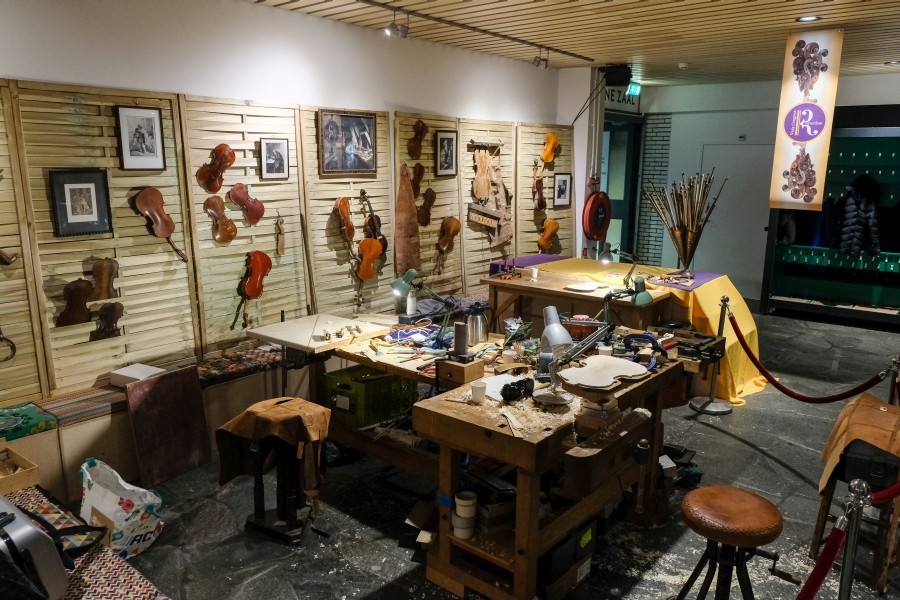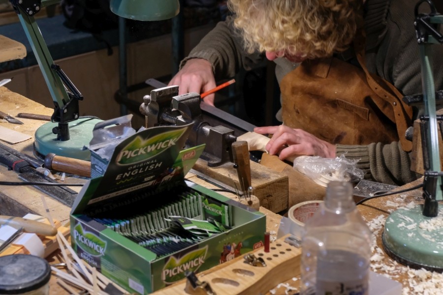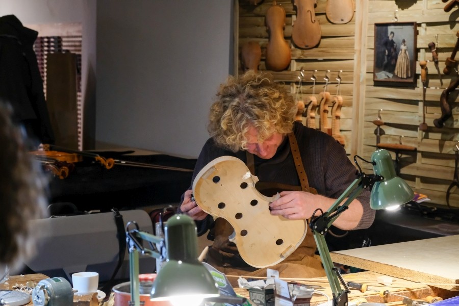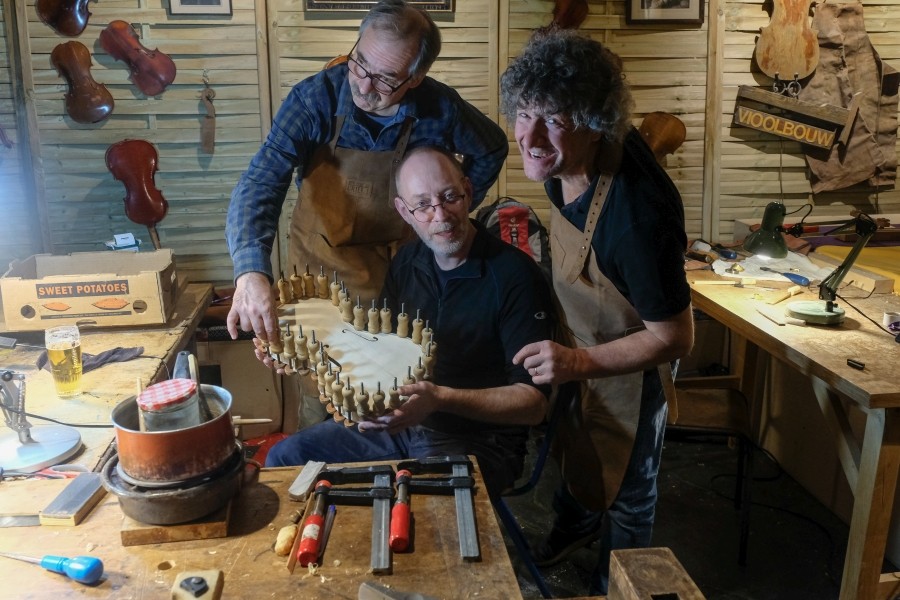 In die Eingangshalle des Hofpleintheaters haben sich die Vier eine Werkstatt eingerichtet. Music4Viola ist vor Ort und berichtet jeden Tag in Bildern über den Fortschritt dieser anspruchsvollen Arbeit. Bei den Live-Bratschenbauern handelt es sich um Chaim Achttienribbe aus Amsterdam (NL), Kai-Thomas Roth aus Somerset (UK), Jan van der Elst aus Dordrecht (NL) und Gijsbert van Ziel aus Rotterdam (NL).
