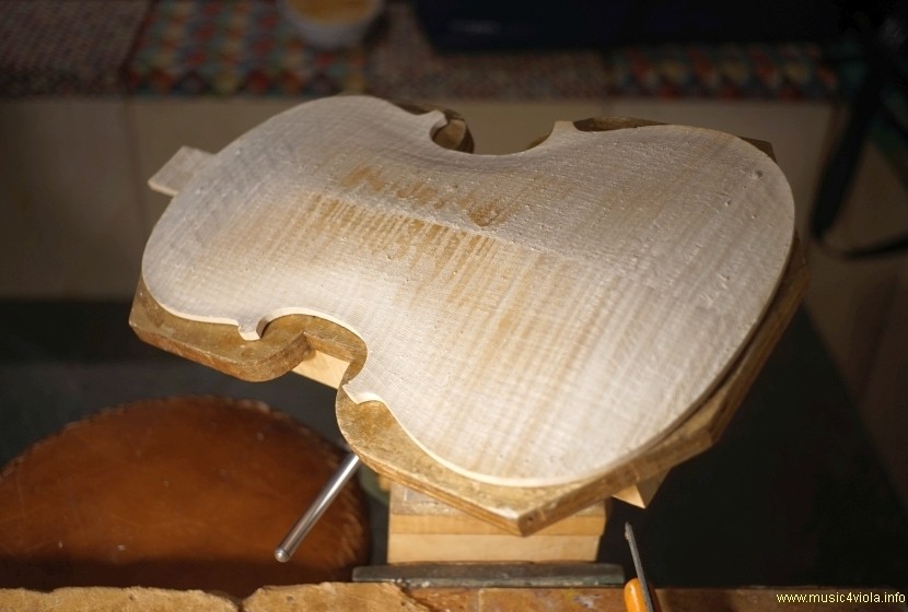 Ganz anders sieht es mit der Maggini aus. Die Wölbung ist extrem voll, die Hohlkele sehr eng. Folglich ist die ganze Wölbung extrem steif. Stehen die Jahresringe beim Holz nun bis zum Rand eng beieinander und senkrecht, wird sich die Bratsche vor lauter Steife kaum noch bewegen können. Eine dünnere Ausarbeitung zum Ausgleich würde klanglich nicht viel positives bewirken, da sich bei derart viel Steife in der Wölbung vor allem die geringere Dämpfung bemerkbar machen würde: Die Bratsche wäre also sehr laut, wahrscheinlich sogar schreiend im Ton. Gute Klangergebnisse erziele ich nur, wenn ich die Maggini mit flexiblerem Holz baue. Steifes Holz mit senkrecht stehenden Jahresringen, die maximal einen Millimeter auseinander stehen gilt unter Geigenbauern zwar generell als «gutes» Holz und ist beim Holzhändler sehr teuer. Für einen Maggini Nachbau wäre es aber zu viel des Guten. Mit vermeintlich «schlechterem» Holz klingt die Bratsche wärmer und weicher. Ganz wichtig außerdem: Die Hohlkehle tief und dünn genug ausarbeiten, um die Flexibilität zu erhöhen. Vielleicht fragen Sie sich an dieser Stelle: Warum tut sich ein Geigenbauer das an, und baut nicht nur Andrea Guarneri Modelle nach? Für mich lautet die Antwort: Weil ich mit dem ungewöhnlichen Maggini Modell bei gefühlvoller Bearbeitung auch einen ungewöhnliche guten Klang erzielen kann! Das dunkle Timbre wird als angenehm weich empfunden, trotzdem ist der Klang kraftvoll genug, um im Saal gut zu tragen.