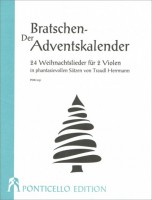 Bei der Ponticello Edition Bernhard Helpenstein, Mainz sind 2016 drei musikalische Adventskalender für die Geige, das Cello und die Bratsche erschienen. «Der Bratschen-Adventskalender» birgt 24 weihnächtliche Lieder für 2 Violen in phantasievollen Sätzen, arrangiert von der Cellistin und Komponistin Traudl Herrmann. Die Stücke beinhalten sämtliche gängigen, aber auch weniger bekannte Weihnachtslieder. Über die Webseite der Ponticello Edition kann gratis ein Pdf mit den Melodien und dazugehörigen Texten heruntergeladen werden. Die Melodien können gesungen oder auf einem Melodieinstrument zu den beiden Bratschen gespielt werden. Für fortgeschrittene Bratschenlernende ist diese Sammlung ein Must für Weihnachten. Einige Lieder eignen sich auch bereits für kleinere BratschistInnen.