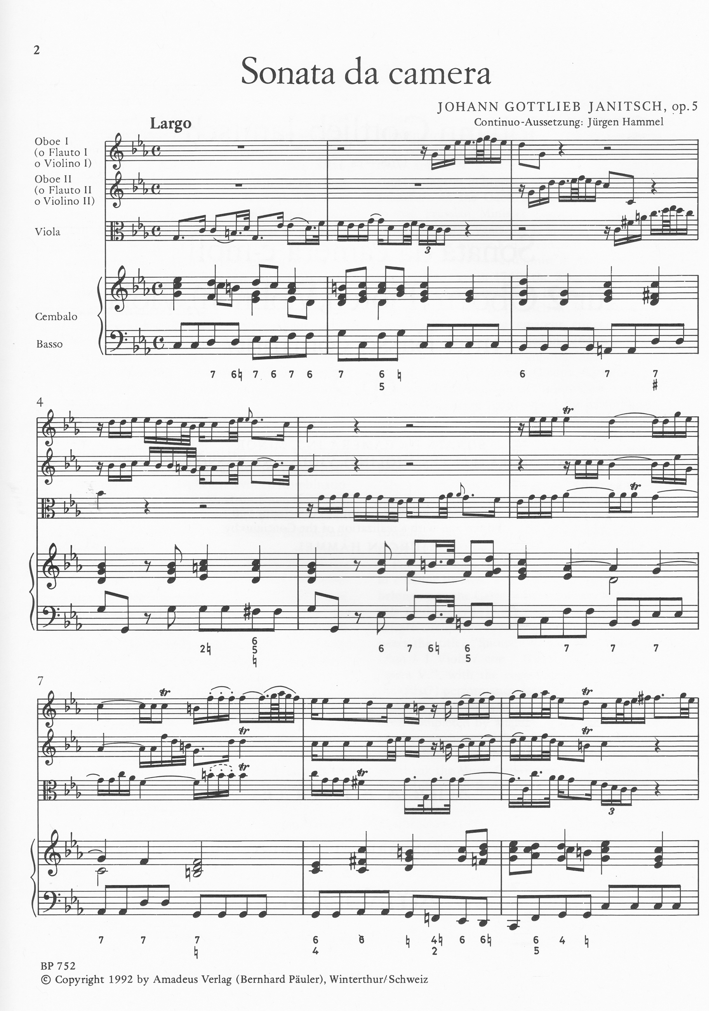 Johann Gottlieb Janitsch: Sonata da camera c-moll op. 5 für 2 Oboen (Flöten, Violinen), Viola und Bc.