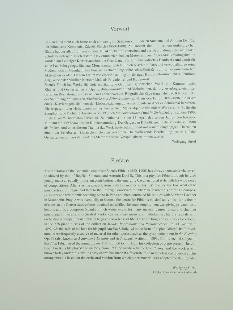 Zu Unrecht steht der böhmische Komponist Zdenek Fibich (1850-1900) im Schatten von Smetana und Dvorák, denn auch er hat entscheidend zur Begründung der nationalen Schule beigetragen. Sein bekanntestes Werk dürfte das unter dem Namen «Poème» bekannt gewordene Seitenthema aus seiner Symphonischen Dichtung «Der Abend» geworden sein. Der Geiger Jan Kubelík spielte diese Melodie seit 1908 unter diesem Titel, und so ist das Werk heute bekannt und mit seinem eingängigen Charme zu einem der beliebtesten klassischen Themen geworden.