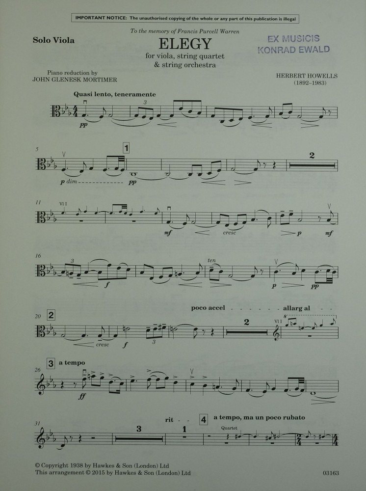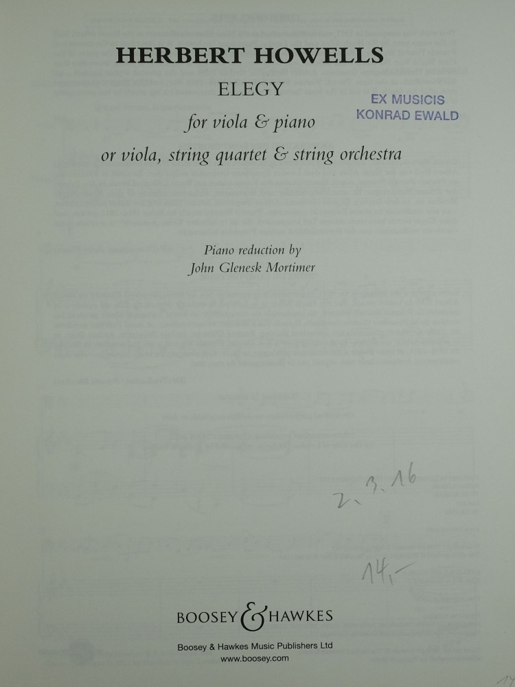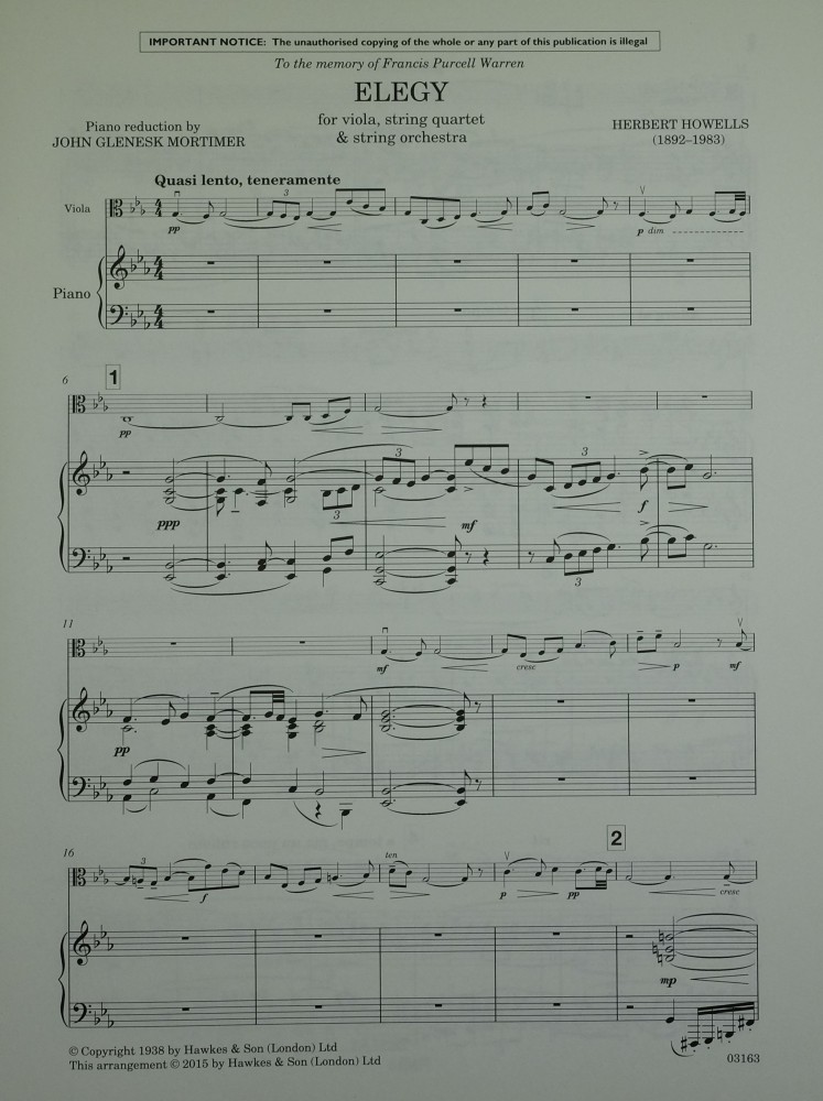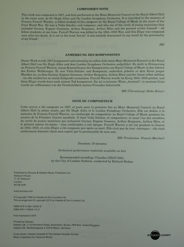 Dieses von Herbert Howell im Jahr 1917 für Viola, Streichquartett und Streichorchester geschriebene Werk wurde im gleichen Jahr bei dem Mons Memorial Concert in der Londoner Royal Albert Hall uraufgeführt. Es ist dem Gedenken an Francis Purcell Warren gewidmet, einem Kommilitonen von Herbert Howells am Royal College of Music während der Jahre des Ersten Weltkrieges. Purcell Warren studierte dort Viola, komponierte selbst und gehörte zu einem Kreis junger Musiker, zu dem auch Ivor Gurney, Eugene Goossens, Arthur Benjamin, Arthur Bliss und auch Herbert Howells zählten, und die alle zur gleichen Zeit am selben Ort studierten. Purcell Warren kam im Ersten Weltkrieg ums Leben, und diese Elegy wurde kurz nach seinem Tod komponiert. Partitur und Stimmen sind als Leihmaterial erhältlich.