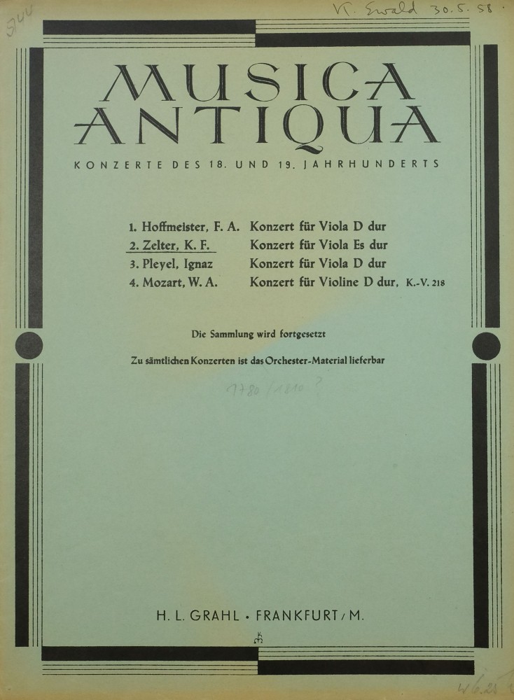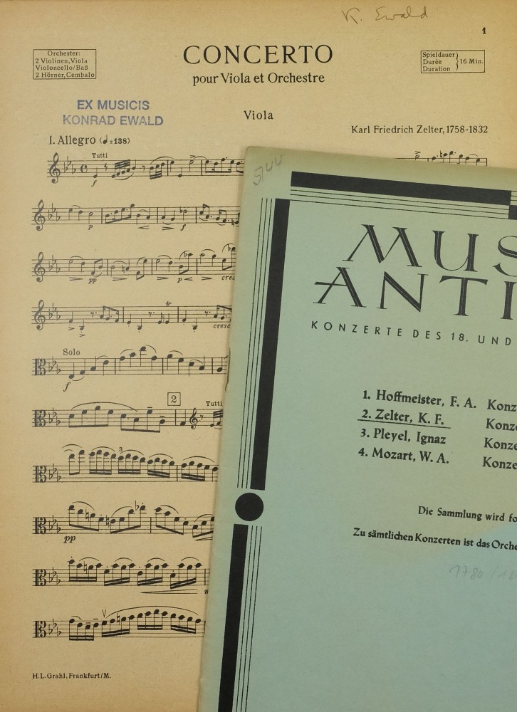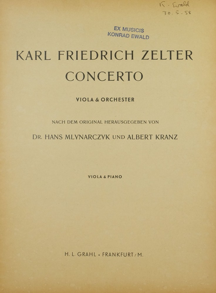 Das Violakonzert in Es von Carl Friedrich Zelter, dem 2. Direktor der Sing-Akademie zu Berlin, gehört heute neben dem Violakonzert in G von Georg Philipp Telemann und den Violakonzerten in D von Carl Stamitz und Franz Anton Hoffmeister unbestritten zum Kanon des klassischen Konzert-Repertoires für solistische Bratsche. Dabei sind die Umstände der Entstehung ganz und gar unkonventionell. Die Begebenheit wird in Carl Friedrich Zelters Darstellungen seines Lebens (hrsg. von Johann-Wolfgang Schottländer, Weimar 1931, S. 118, 120 f. [= Schriften der Goethe-Gesellschaft, Bd. 44]) von Zelter selbst geschildert. Demnach entstand das Konzert im Rahmen eines Tauschs zwischen ihm und zwei anderen Personen, bei dem Zelter schließlich für das neu komponierte Violakonzert im Gegenzug die Partitur von Georg Bendas Ariadne auf Naxos zum Abschreiben geliehen bekam. Weiterhin heißt es: «Nun hatte ich auch mein Bratschenkonzert fertig. Es war in neuern Zeiten der erste eigentliche Versuch, in einem Konzerte etwas mehr als das bloß Spielen, das Hörenlassen zum besten zu geben. Ein pathetisches Allegro sollte eine ernsthafte Stimmung geben, darauf sollte ein tief bewegendes Adagio dieser Stimmung Unruhe und große Arbeit schaffen, die sich zuletzt im Rondo zu freier Behaglichkeit erheben und das Ganze heiter abschließen sollte. Das Konzert selber aber sollte ein Ganzes sein, und deshalb hatte ich aus dem Adagio etwas in das Rondo verwebt, das rezitativisch vorgetragen wurde. […] Ich wußte nur zu gut, wie sauer mir dieses Konzert geworden war, um meine Intention darin nur einigermaßen klarzumachen. Diese Intention bestand in nichts Geringerem, als ein klassisches Werk zu liefern und mich bei Kennern geltend zu machen.» (Ebd. S. 120 f.)