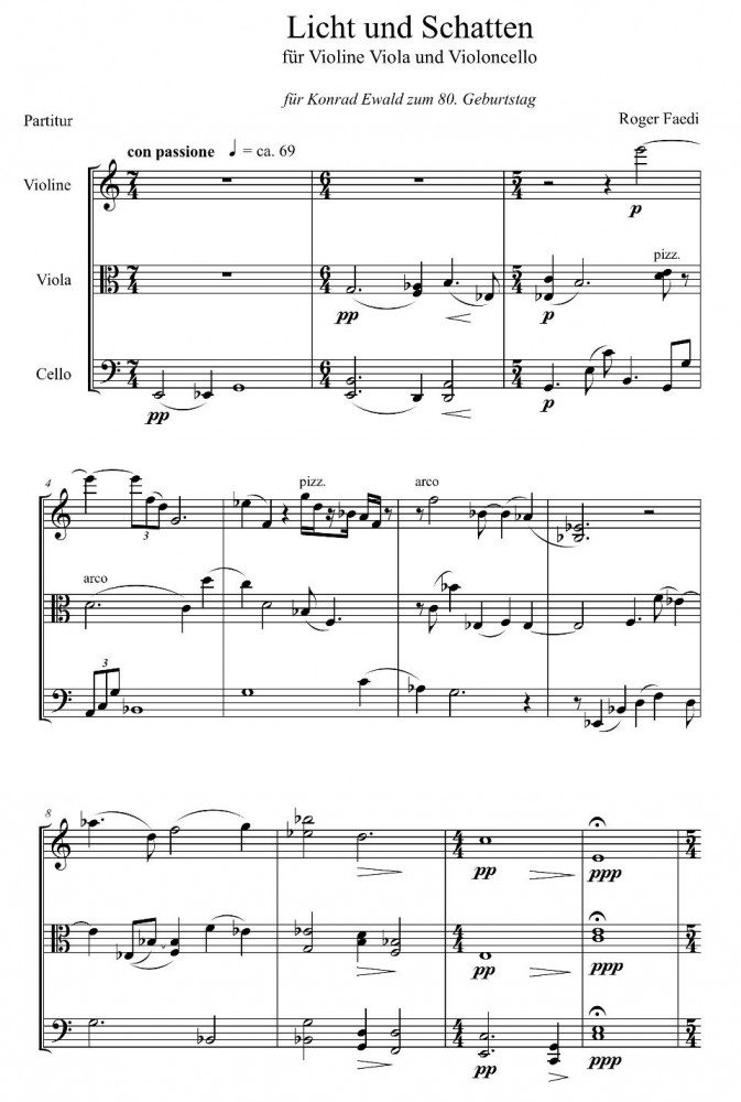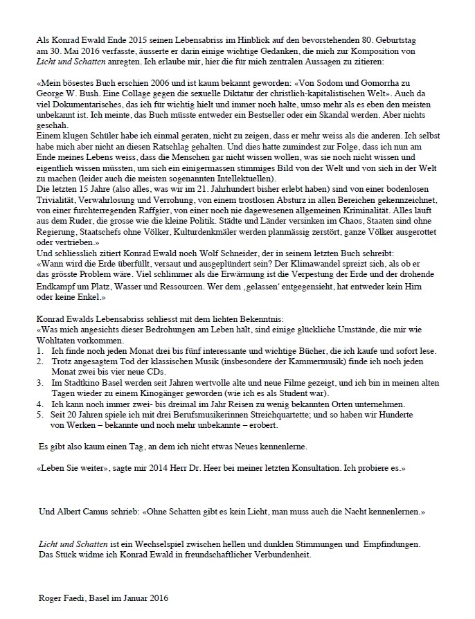 Albert Camus schrieb: «Ohne Schatten gibt es kein Licht, man muss auch die Nacht kennenlernen.» Licht und Schatten ist ein Wechselspiel zwischen hellen und dunklen Stimmungen und Empfindungen. Das Stück widme ich Konrad Ewald in freundschaftlicher Verbundenheit. Roger Faedi