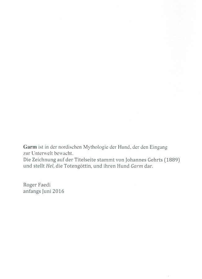 Das Stück Garm, das ich am 6.6.2016 geschrieben habe, ist ein klingender «Endzeit-Dialog» zwischen Garm und Hel. Die Spieldauer beträgt knapp vier Minuten. Garm liegt auch in einer Fassung für Klarinette und Klavier vor.