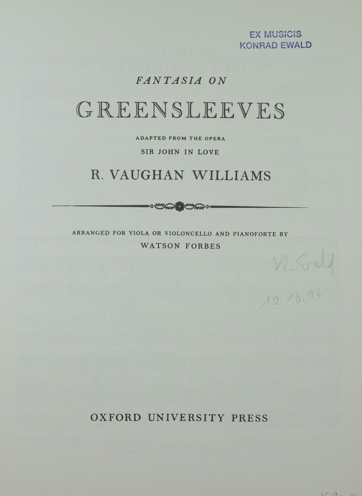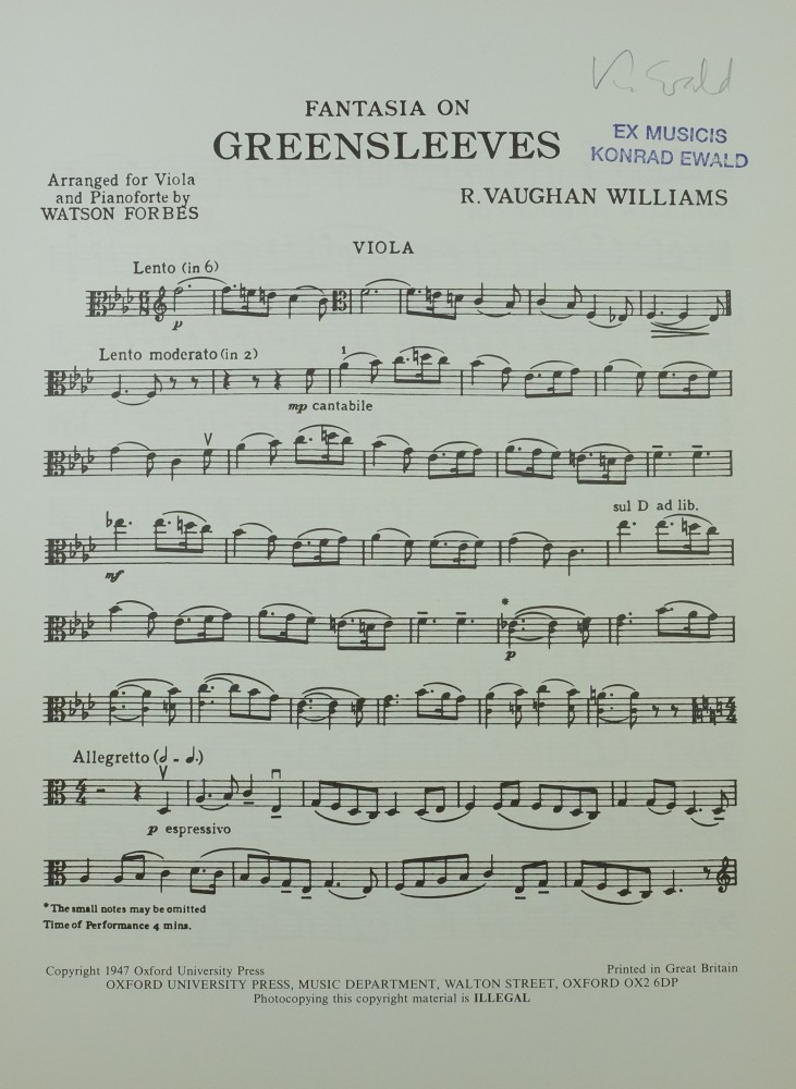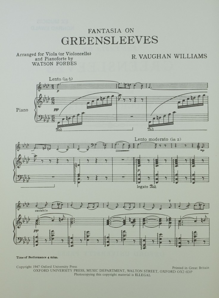 Fantasia on Greensleeves, adapted from the Opera «Sir John in Love», für Violoncello (Bratsche) und Klavier
