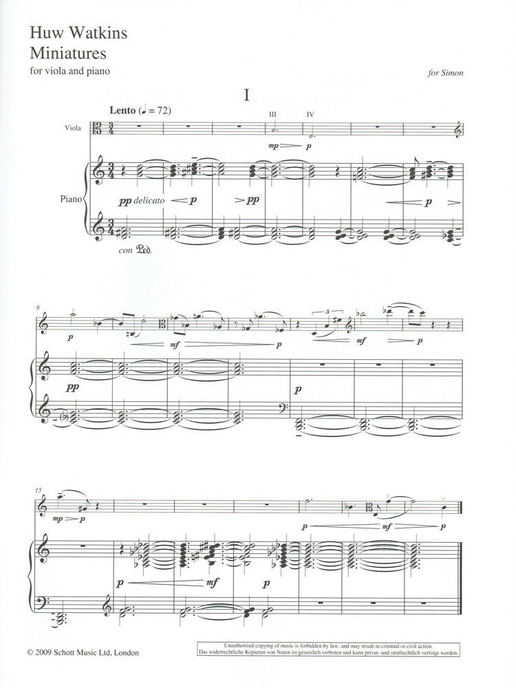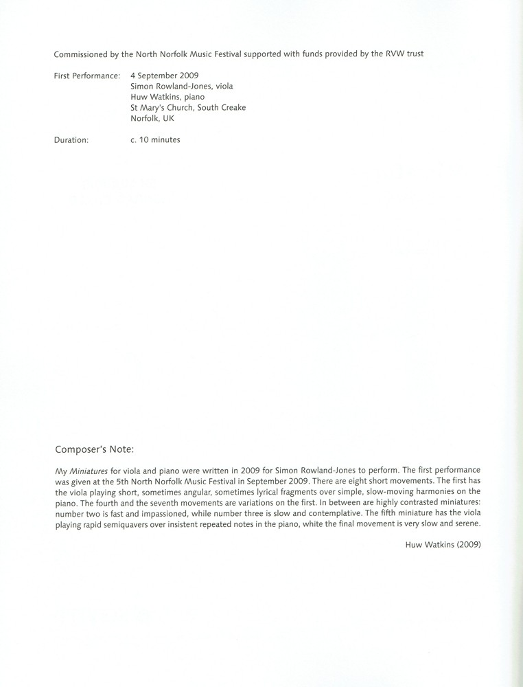 Miniatures von Huw Watkins wurde für den Bratschisten Simon Rowland-Jones geschrieben und 2009 am North Norfolk Music Festival uraufgeführt. Das Werk hat acht kurze Sätze: Im ersten spielt die Bratsche kurze, mal geometrische, mal lyrische Fragmente über den einfachen, langsamen Harmonien des Klaviers. Der vierte und der siebte Satz sind Variationen des ersten. Die dazwischen liegenden Miniaturen sind kontrastreich: Nummer Zwei ist schnell und temperamentvoll, Nummer Drei dagegen langsam und nachdenklich. In der fünften Miniatur spielt die Bratsche schnelle Sechzehntel über sich unnachgiebig wiederholenden Klavierklängen, der letzte Satz ist dafür sehr langsam und gelassen. (Huw Watkins)
