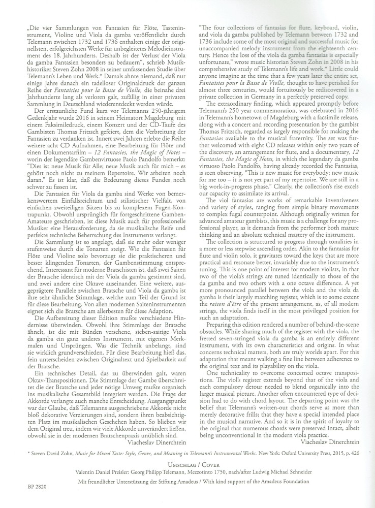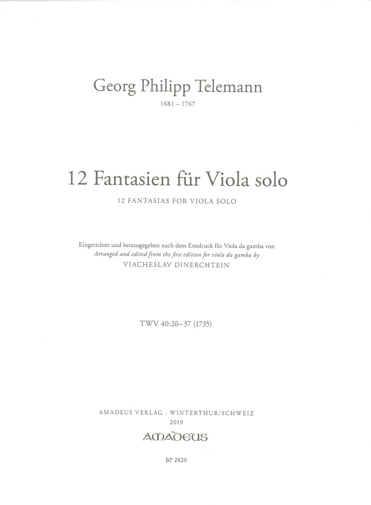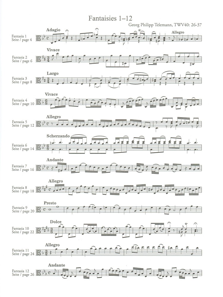 Eingerichtet un d herausgegeben nach dem Erstdruck für Viola da gamba https://music4viola.info/werk-info/27/Telemann%20G.ph./12-fantasien-twv-40-26-37-fuer-bratsche-solo