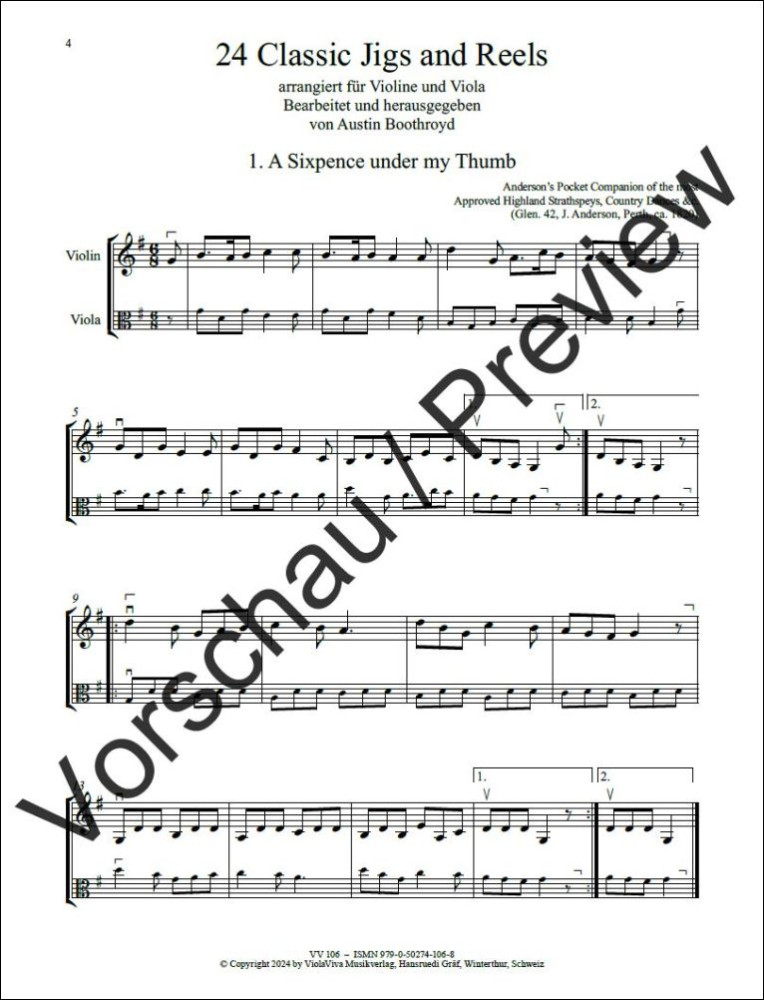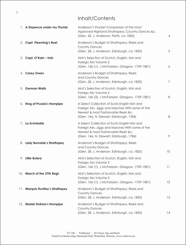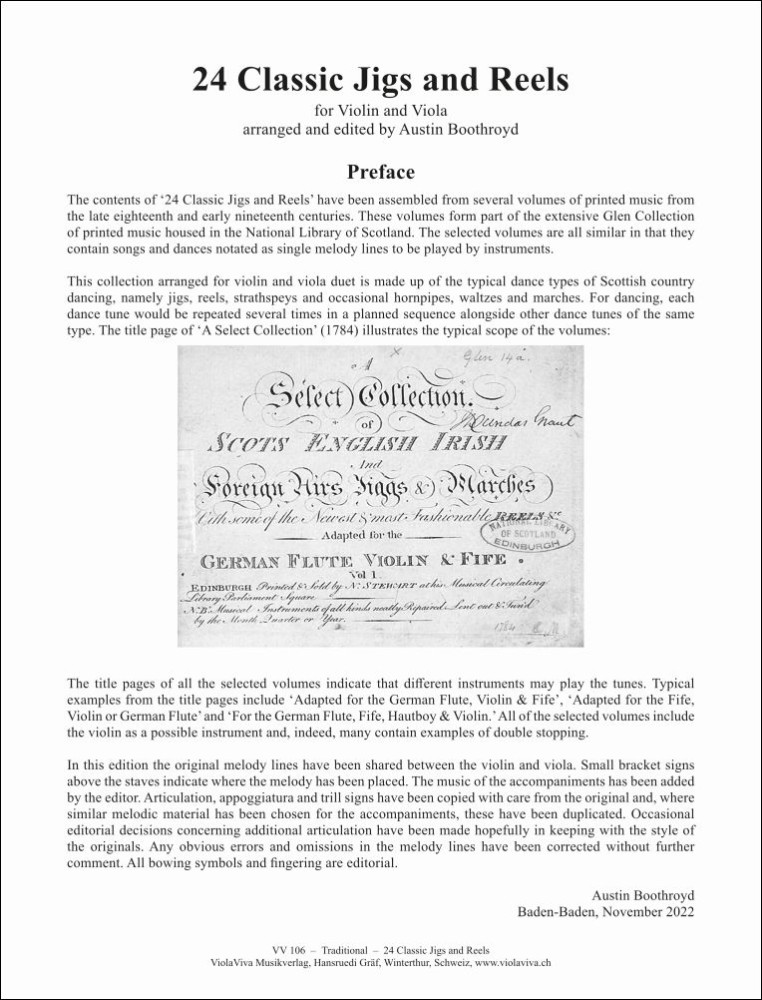 Der Inhalt von «24 Classic Jigs and Reels- wurde aus mehreren Bänden gedruckter Musik aus dem späten achtzehnten und frühen neunzehnten Jahrhundert zusammengestellt. Diese Bände sind Teil der umfangreichen Glen Collection of printed music, die in der National Library of Scotland aufbewahrt wird. Die ausgewählten Bände ähneln sich alle insofern, als sie Lieder und Tänze enthalten, die als einzelne Melodielinien notiert sind und von Instrumenten gespielt werden können.