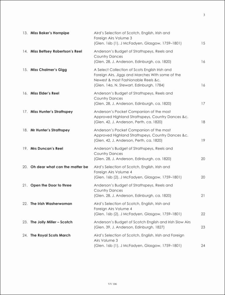 1. A Sixpence under my Thumb 2. Capt. Fleeming's Reel 3. Capt. O'Kain - Irish 4. Carey Owen 5. German Waltz 6. King of Prussia's Hornpipe 7. La Scimballe 8. Lady Burnside's Strathspey 9. Lillie Bulera 10. March of the 37th Regt. 11. Marquis Huntley's Strathspey 12. Master Erskine's Hornpipe 13. Miss Baker's Hornpipe 14. Miss Bettsey Robertson's Reel 15. Miss Chalmer's Gigg 16. Miss Elder's Reel 17. Miss Hunter's Strathspey 18. Mr Hunter's Strathspey 19. Mrs Duncan's Reel 20. Oh dear what can the matter be 21. Open the Door to three 22. The Irish Washerwoman 23. The Jolly Miller - Scotch 24. The Royal Scots March