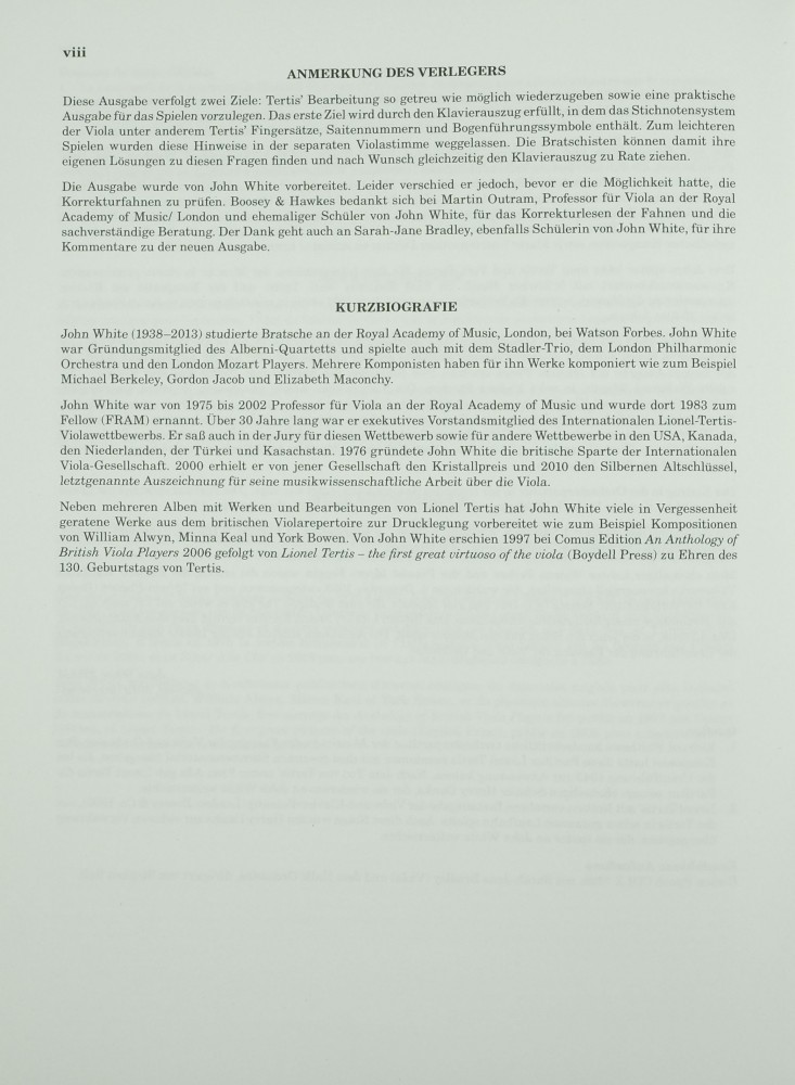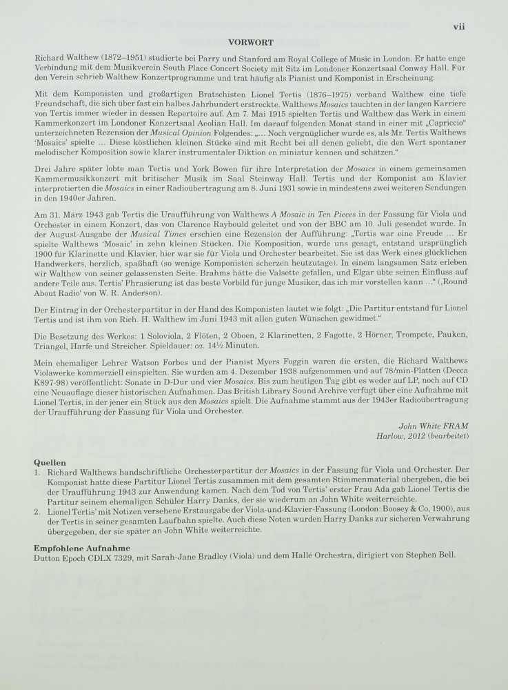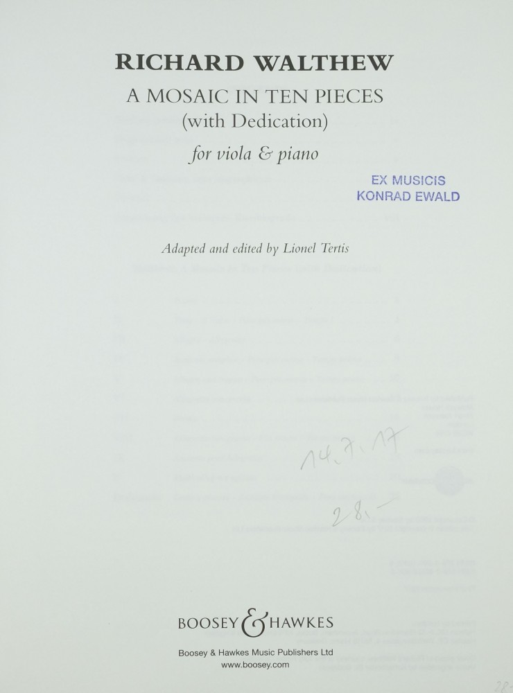 Neuausgabe dieser hinreissenden Suite des britischen Komponisten Richard Walthew (1872-1951), die erstmals im Jahr 1900 veröffentlicht wurde. Das Stück hat der britische Bratschist Lionel Tertis im Laufe seiner langen Karriere oftmals aufgeführt. Da seine Fingersätze und Bogenführung für Lehrende und Studierende von grossem Interesse sind, sind sie als zusätzliche Information im Klavierauszug enthalten; in der Viola-Stimme wurde auf diese Angaben verzichtet, um ein möglichst «sauberes» Notenbild zu erzielen und dem Aufführenden Raum für eigene Entscheidungen zu geben. Lionel Tertis spielte die Uraufführung von [A Mosaic in Ten Pieces] in der Version für Viola und Orchester bei einer Konzertübertragung der BBC im Kriegsjahr 1943. Die Musical Times schrieb damals in einer Rezension des Konzertes: «Es ist das Werk eines frohen Handwerkers, genial, zu Scherzen aufgelegt (so wenige Komponisten neigen zu Scherzen in diesen Zeiten). In einem langsamen Teil erreicht Walthew seine gelassene Grösse. Brahms hätte die Valsette gefallen, Elgar hätte vermutlich andere Favoriten gehabt. Tertis' Phrasierung ist wohl die beste Lehrstunde, die ich mir für jeden jungen Musiker vorstellen kann...»