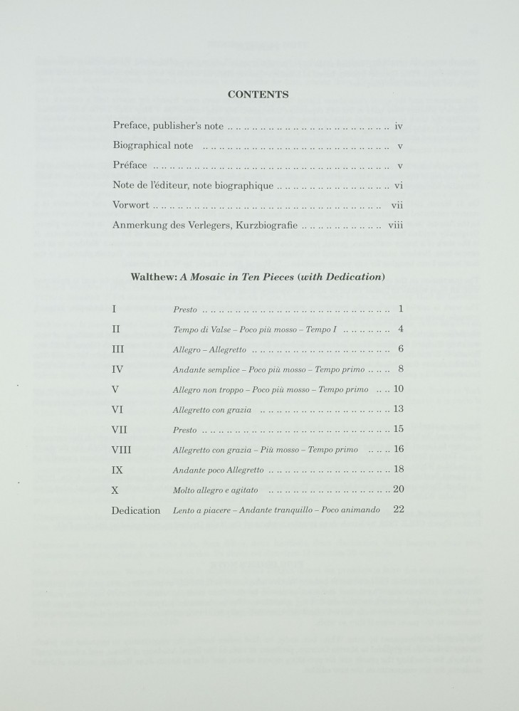 Preface, publisher's note - Biographical note - Préface - Note de l'editeur, note biographique - Vorwort - Anmerkung des Verlegers, Kurzbiografie - Walthew: A Mosaic in Ten Pieces (with Dedication) - I (Presto) - II (Tempo di Valse, Poco più mosso, Tempo I) - III (Allegro, Allegretto) - IV (Andante semplice, Poco più mosso, Tempo primo) - V (Allegro ma non troppo, Poco più mosso, Tempo primo) - VI (Allegretto con grazia) - VII (Presto) - VIII (Allegretto con grazia, Più mosso, Tempo primo) - IX (Molto allegro e agitato) - Dedication (Lento a piacere, Andante tranquillo, Poco animando)